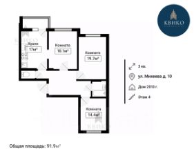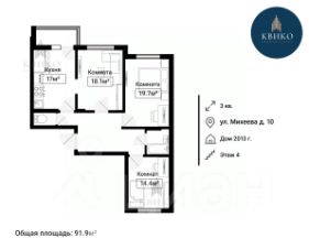 - Трёхкомнатная квартира с удобной планировкой: просторная кухня - 17 м, 3 изолированные комнаты - 18,1 м, 19,7 м и 14,4 м.