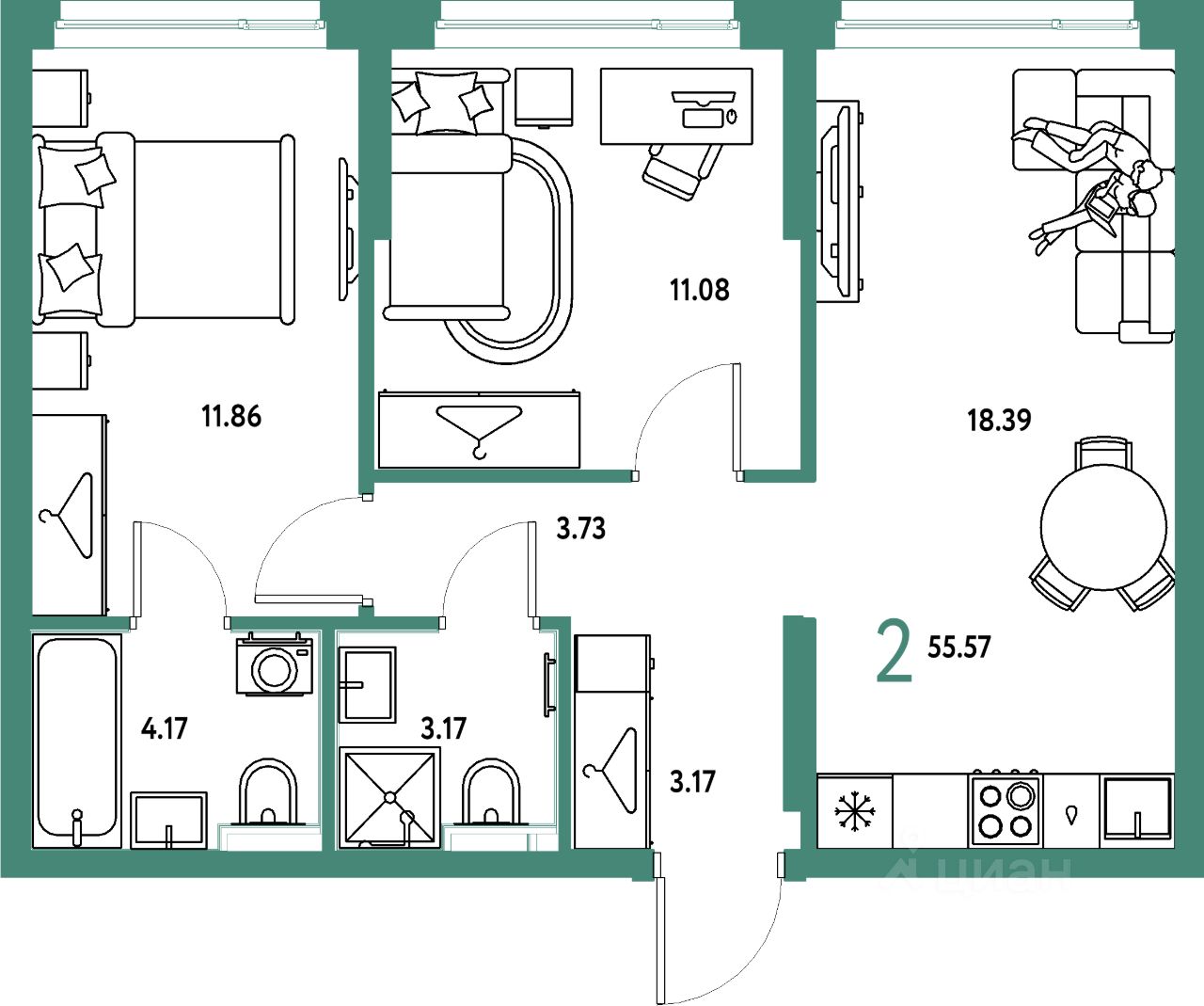 Продаётся 2-комнатная квартира в строящемся доме (Потенциал), срок сдачи: IV-кв. 2027, общей площадью 55.57 кв.м., на 5 этаже. Новый жилой комплекс "Страна.Энтузиастов" от группы компаний "Страна Девелопмент" расположен по адресу: г. Екатеринбург, по ул. Шефская.