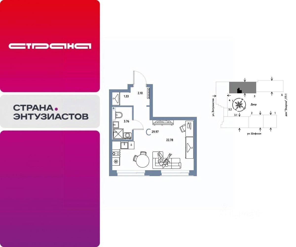 Продается 1комнатная квартира на 7 этаже от застройщика Страна Девелопмент. Площадь квартиры 29,97 кв. м.