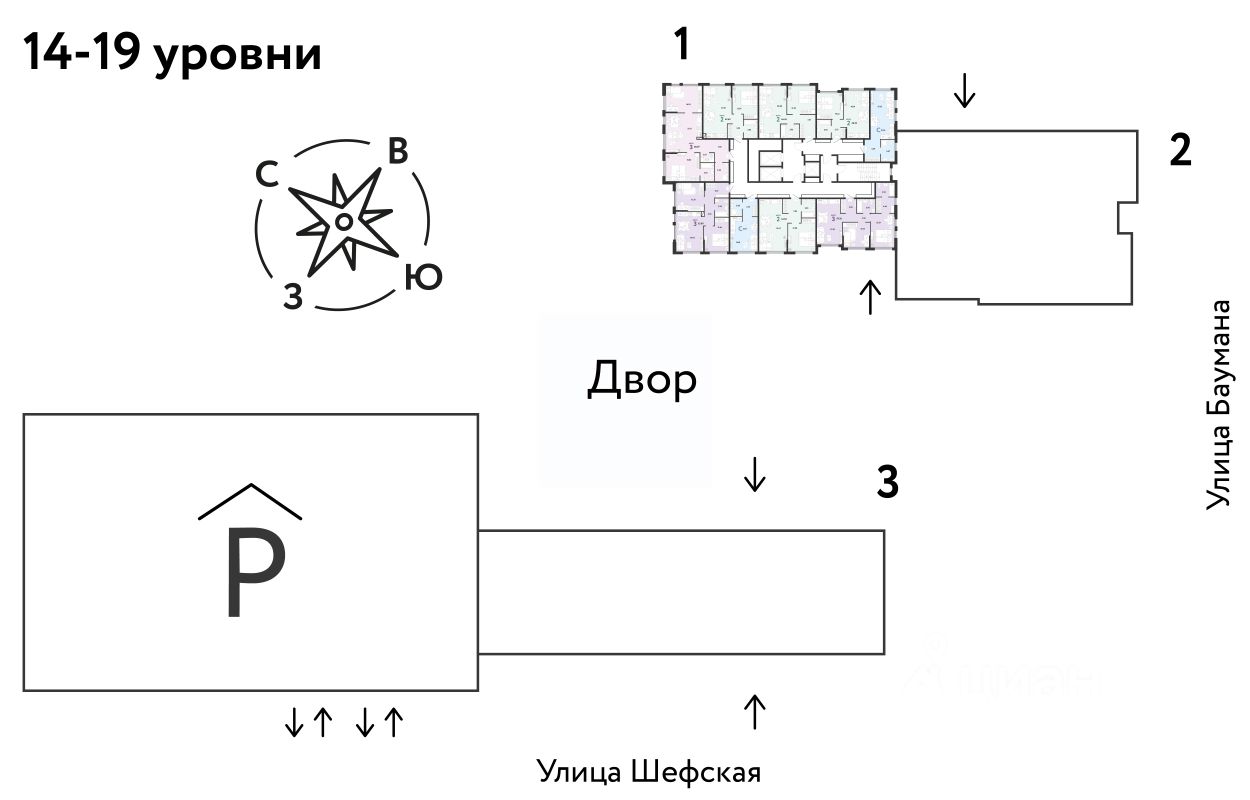 • На первых этажах находятся торговые и офисные помещения. В них располагаются полезные сервисы для жителей: рестораны, магазины, пекарни, кофейни, аптеки, салоны красоты и пункты выдачи заказов. Для каждого помещения спроектирован отдельный вход, витражное остекление и место под вывеску.