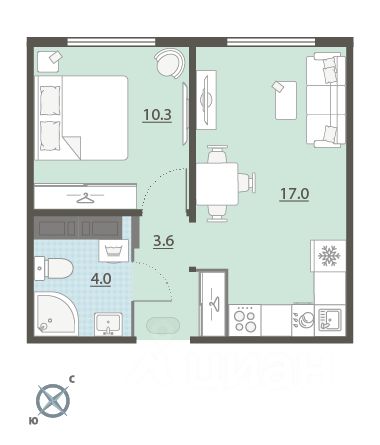 Жилая площадь 10.3 м2, кухня 17 м2, чистовая отделка. Раздельных санузлов - нет, балконов - нет, лоджий - нет.