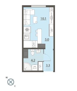 Жилая площадь 10.1 м2, кухня 5 м2, чистовая отделка. Раздельных санузлов - нет, балконов - нет, лоджий - нет.