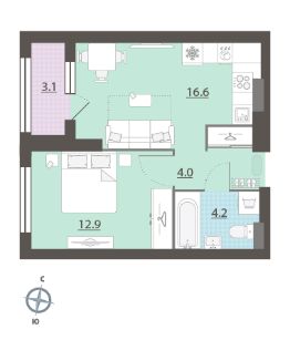 Жилая площадь 13.1 м2, кухня 16.3 м2, чистовая отделка. Раздельных санузлов - нет, балконов - нет, лоджий - 1.