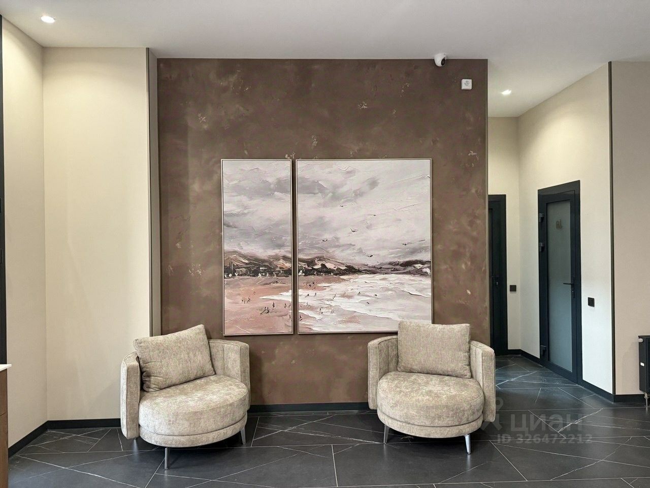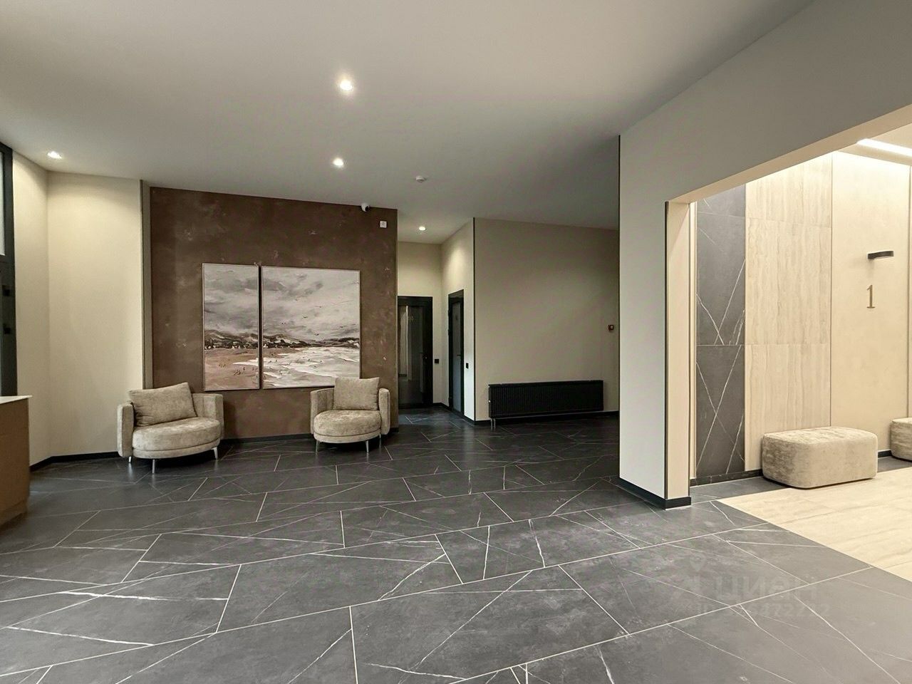 Особенная архитектура. Холл жилого комплекса выполнен в элегантных и минималистичных тонах. Служба мониторинга.
