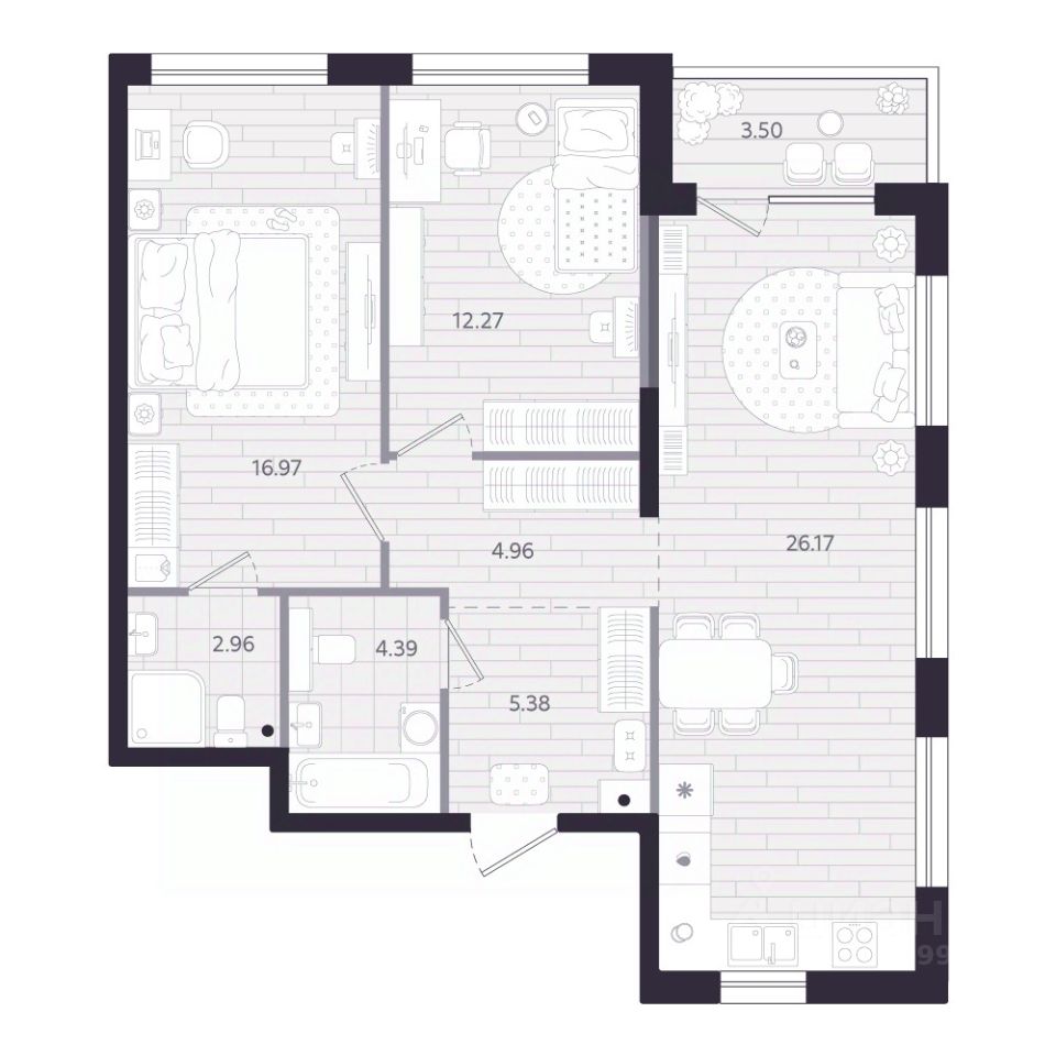 Продаётся 2-комнатная квартира в строящемся доме (Дом 1.1), срок сдачи: II-кв. 2028, общей площадью 74.88 кв.м., на 19 этаже. Новый жилой комплекс "Тетро" от застройщика "Люди" расположен по адресу: г. Екатеринбург, улица Героев России.