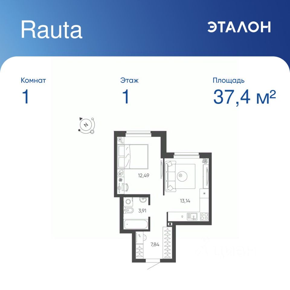 Общая площадь квартиры — 37.38 кв. м, этаж 1 из 24.