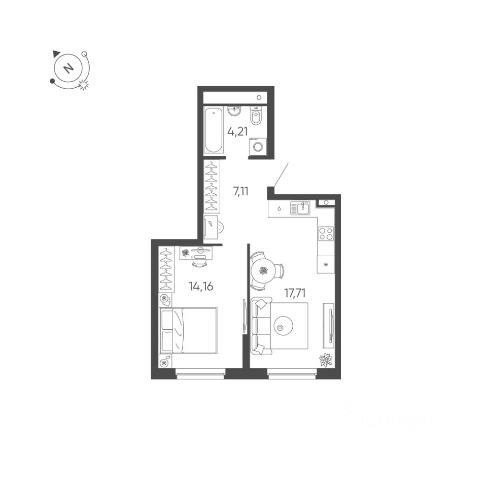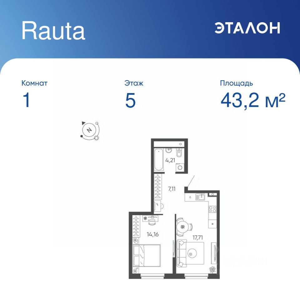 Общая площадь квартиры — 43.19 кв. м, этаж 5 из 24.