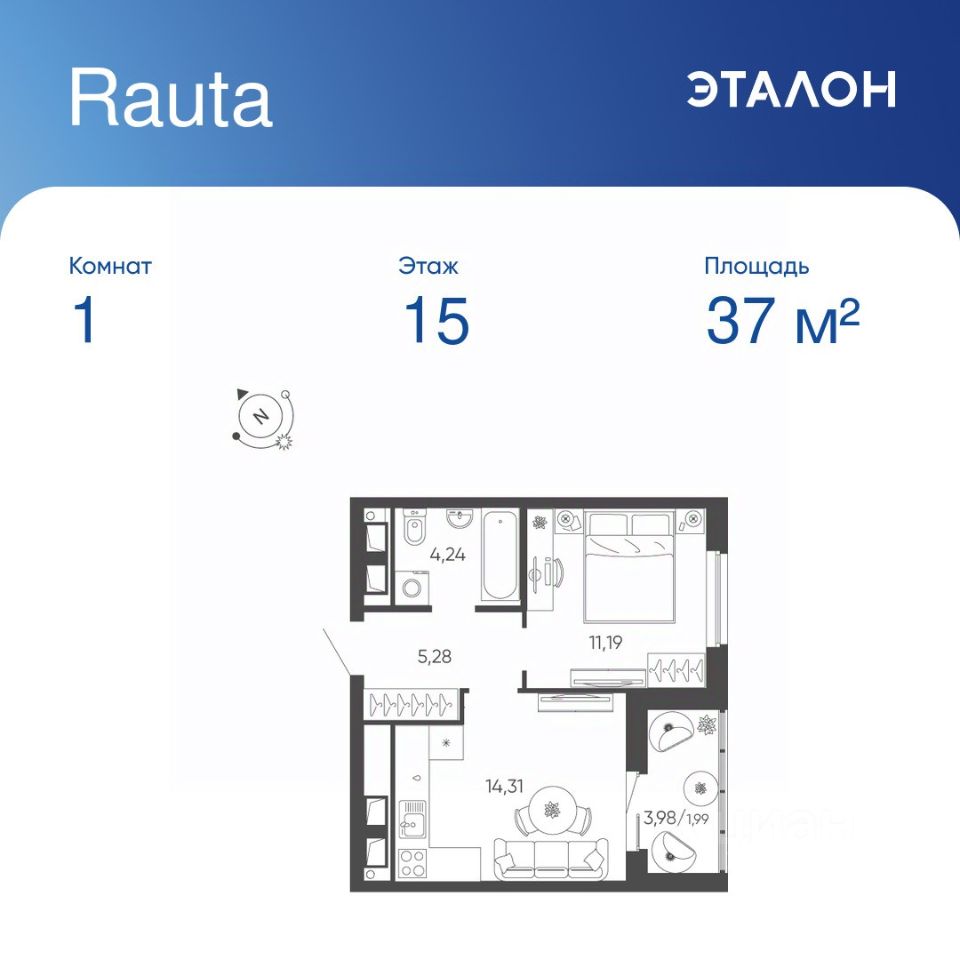 Общая площадь квартиры — 37.01 кв. м, этаж 15 из 24.