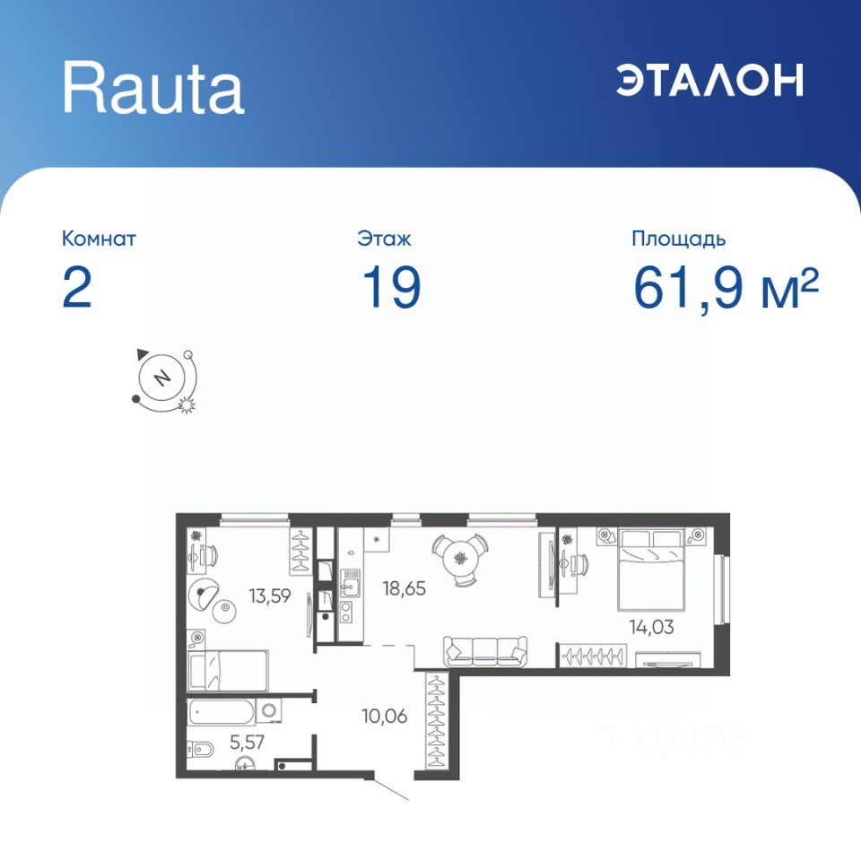 Общая площадь квартиры — 61.9 кв. м, этаж 19 из 24.