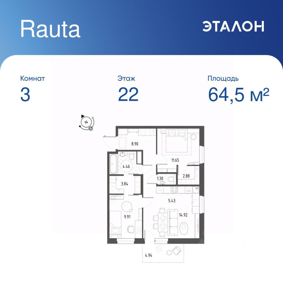 Общая площадь квартиры — 64.5 кв. м, этаж 22 из 22.