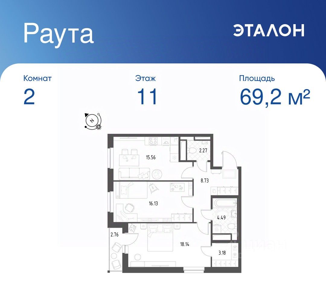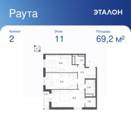 Общая площадь квартиры — 69.2 кв. м, этаж 11 из 25.