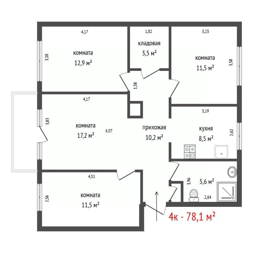 Квартира площадью 78,1 кв. м. Жилая площадь составляет 53,3 кв. м. Кухня просторная и функциональная, площадью 8,5 кв. м. Комнаты расположены продуманно: три спальни и гостиная — идеально для большой семьи. Есть гардеробная комната для хранения вещей. Из окон открывается живописный вид на набережную города и Высоцкий.