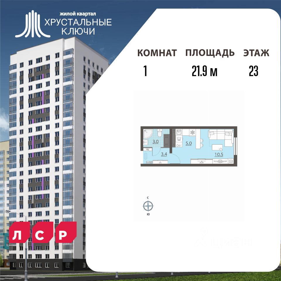 Квартира располагается на 23 этаже 25-этажного дома в ЖК Хрустальные Ключи.