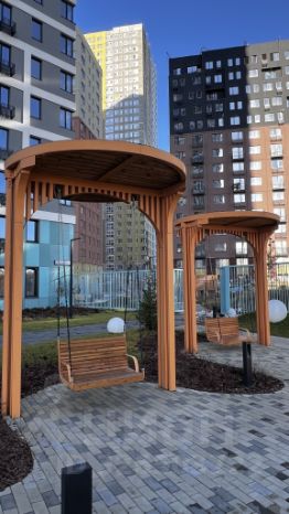 * Двор — как парк: много зелени, детские площадки, теннисные столы, зоны отдыха, уютные места для работы и встреч, плюс огороды жильцов — летом собираете свою клубнику