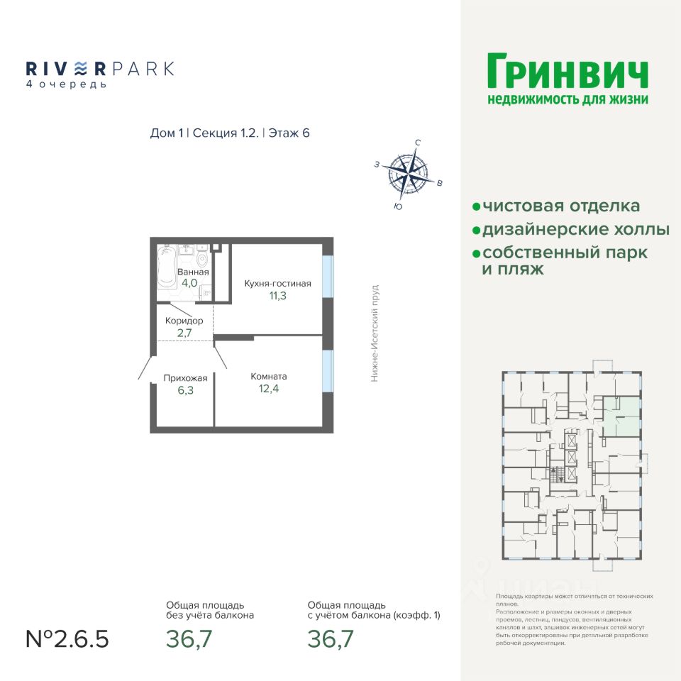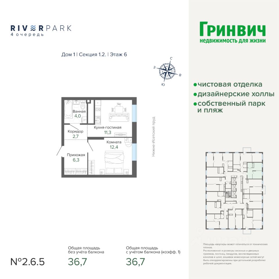 Продаётся 1-комнатная квартира в строящемся доме (Секция 2), срок сдачи: III-кв. 2026, общей площадью 36.73 кв.м., на 6 этаже. "Атлас Ривер" - это проект от "Атлас Девелопмент" в самом экологичном и природном районе Уктуса. Три высотки расположены в наиболее выигрышной локации квартала: в непосредственной близости к парку и набережной Нижнеисетского пруда.