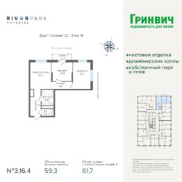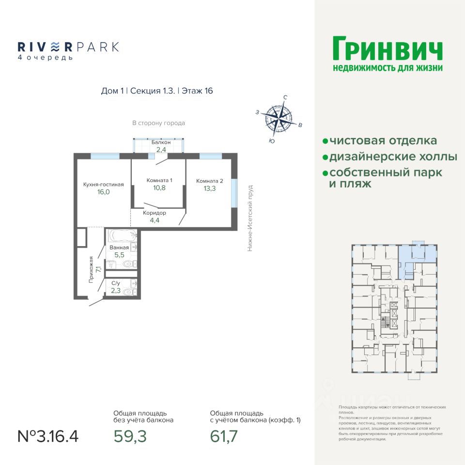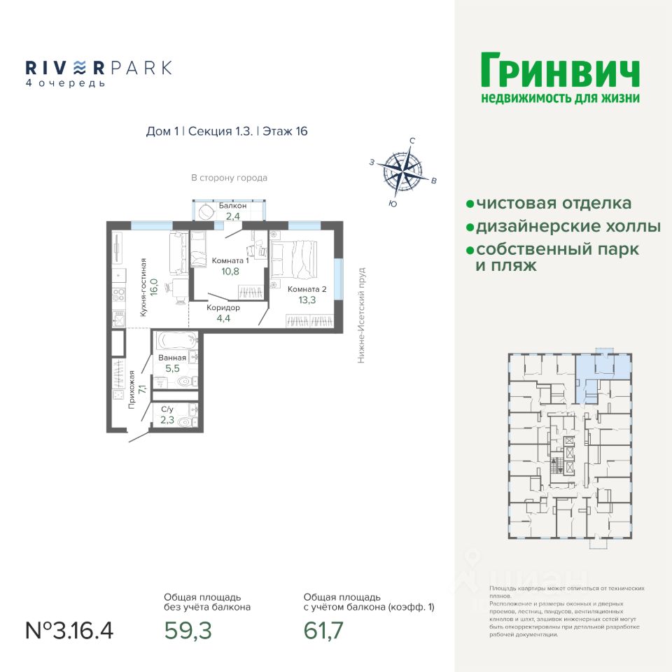 Продаётся 2-комнатная квартира в строящемся доме (Секция 3), срок сдачи: III-кв. 2026, общей площадью 61.68 кв.м., на 16 этаже. "Атлас Ривер" - это проект от "Атлас Девелопмент" в самом экологичном и природном районе Уктуса. Три высотки расположены в наиболее выигрышной локации квартала: в непосредственной близости к парку и набережной Нижнеисетского пруда.