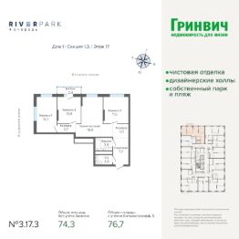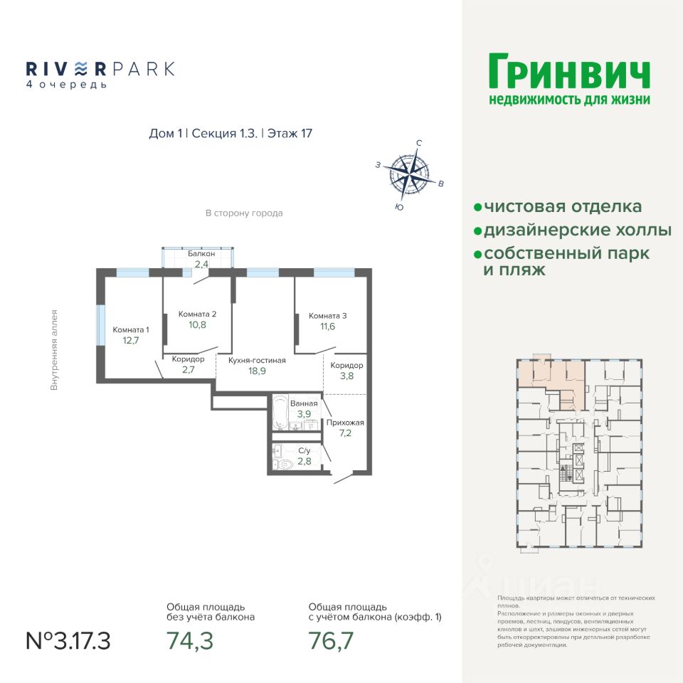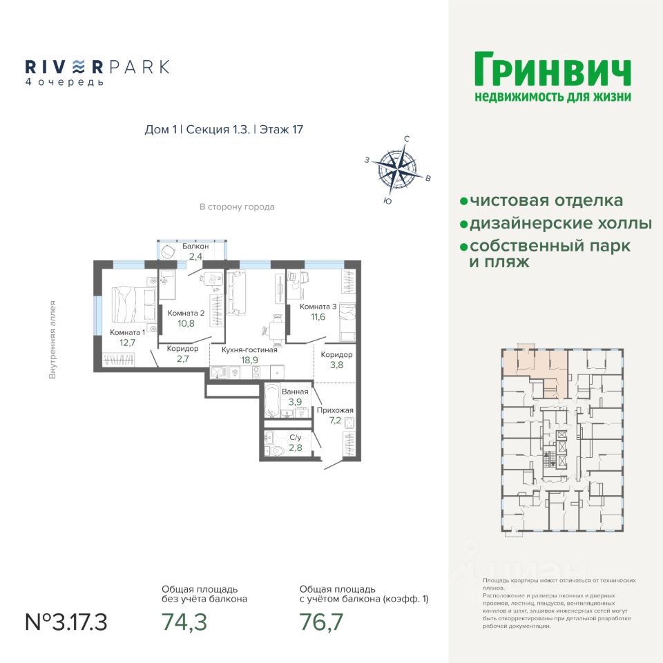 Продаётся 3-комнатная квартира в строящемся доме (Секция 3), срок сдачи: III-кв. 2026, общей площадью 76.7 кв.м., на 17 этаже. "Атлас Ривер" - это проект от "Атлас Девелопмент" в самом экологичном и природном районе Уктуса. Три высотки расположены в наиболее выигрышной локации квартала: в непосредственной близости к парку и набережной Нижнеисетского пруда.