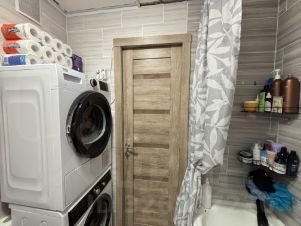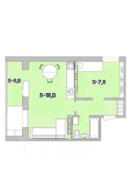 Продается евродвушка с теплой лоджией. Комната 7,8 кв.м, кухня-студия 18 кв.м и лоджия 8 кв.м. Ванная комната в кафельной плитке, в квартире ламинат.