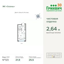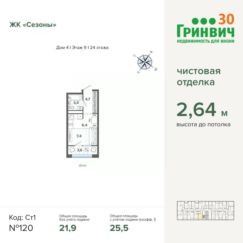 Продаётся студия в строящемся доме (Дом 4), срок сдачи: I-кв. 2026, общей площадью 25.46 кв.м., на 9 этаже. Квартира от застройщика