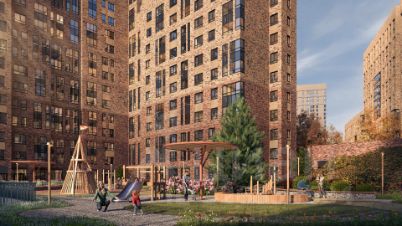 Двор закрыт от машин и посторонних - доступ только для жителей по электронному ключу, видеонаблюдение 24/7. Дизайн двора выполнен в экостиле - из натуральных материалов. Качели, горки и скамейки выполнены в природных оттенках.
