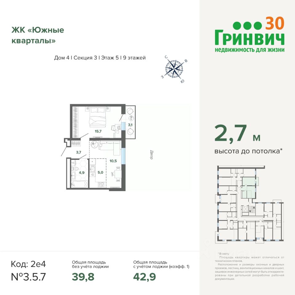 • Потолок 2,7 м