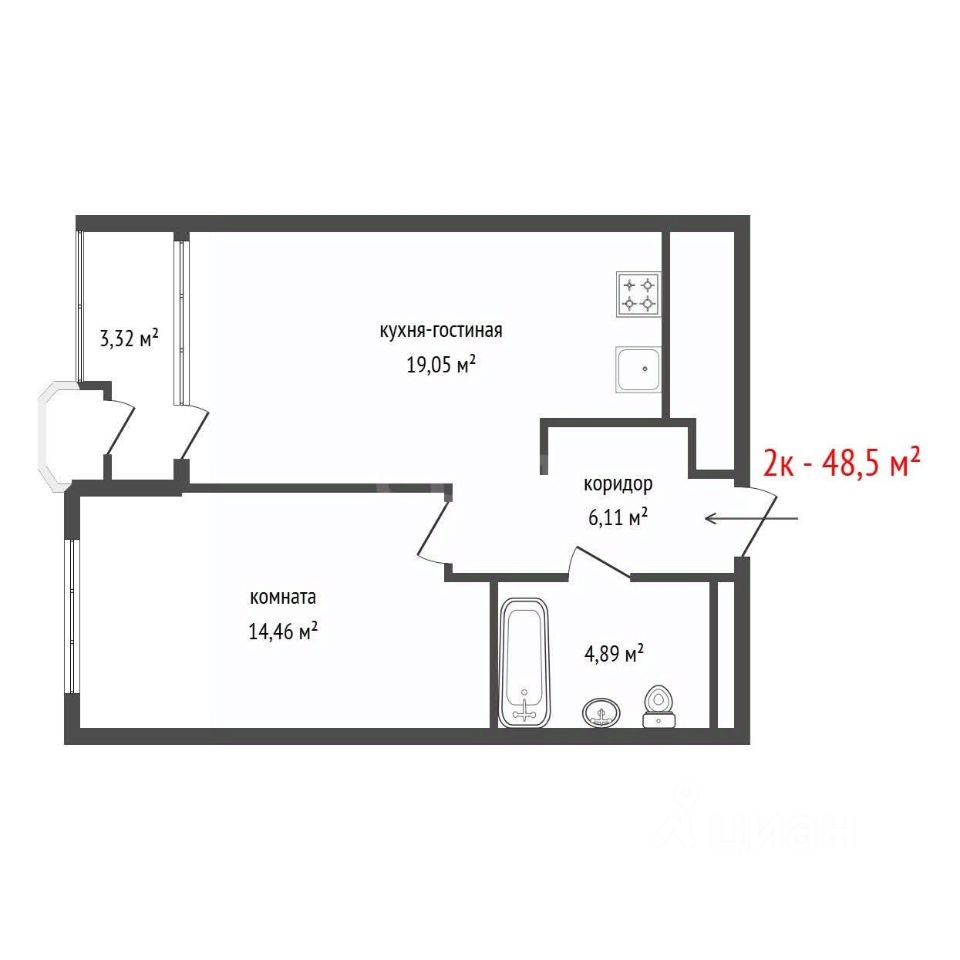 В распланировке сохранена функциональная кухня "Мария" со встроенной техникой: холодильником, варочной поверхностью и духовым шкафом, что обеспечивает полную готовность к заселению.