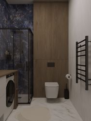 На полу уложен кварцвинил, плинтуса, на стенах флизелиновые влагостойкие обои, стены окрашены моющейся краской, установлены декоративные панели. В санузле дорогой керамогранит, установлена инсталляция и душевой уголок. Натянут потолок, сделано освещение. Все материалы и сантехника заказаны в дорогой дизайн-студии, не Леруа Мерлен!