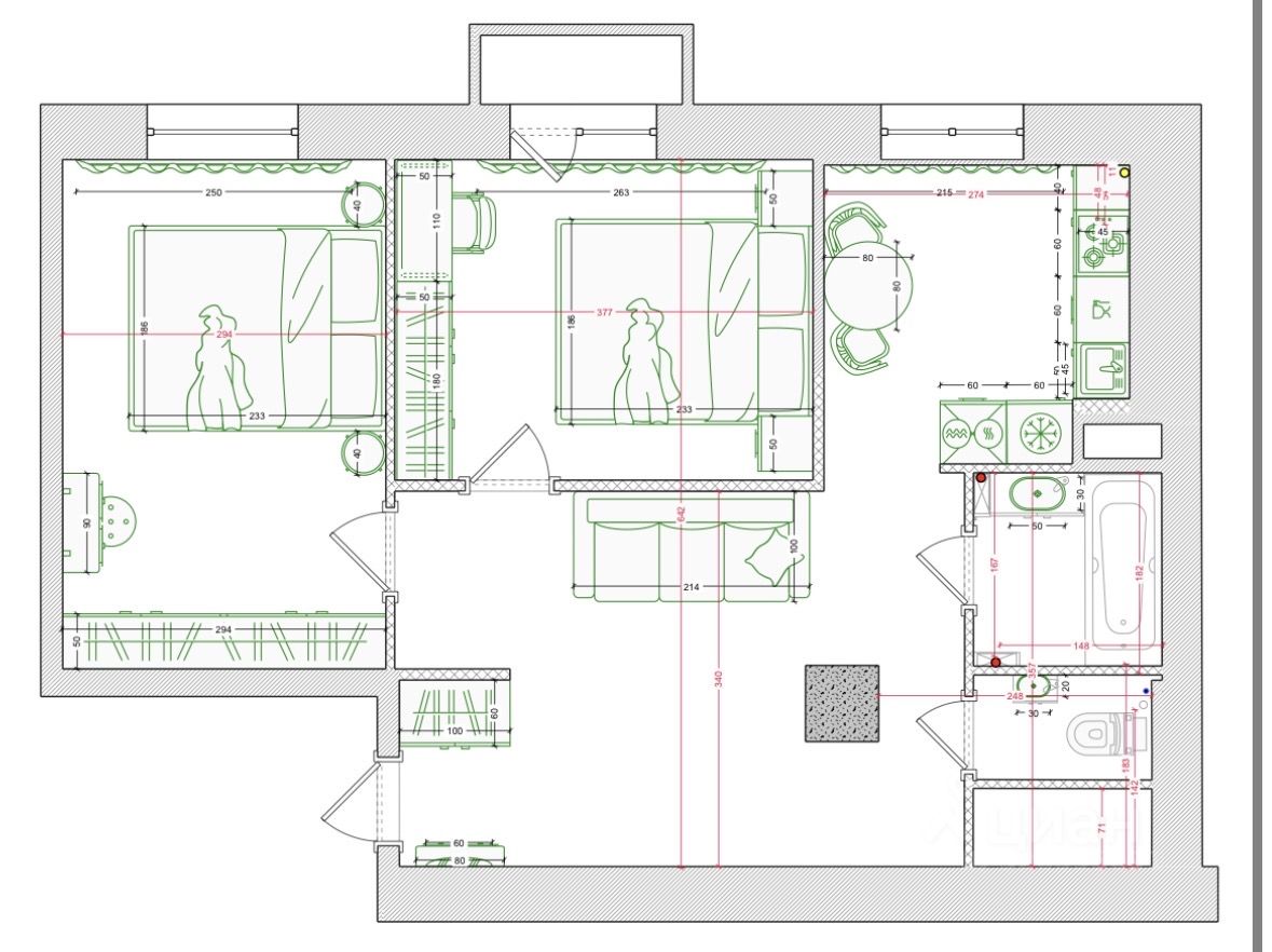 Удобная функциональная планировка: кухня-гостиная, две изолированные комнаты, раздельный с/у, кладовая-постирочная.