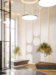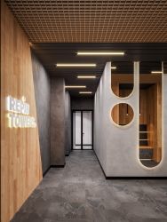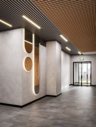 Дизайнерские холлы. Парадный холл с остеклением в пол, гостевыми санузлами и зонами ожидания.