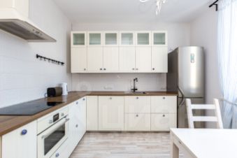 Новым владельцам оставим кухонный гарнитур IKEA, укомплектованный техникой: варочная поверхность, духовка с функцией СВЧ, вытяжка, посудомоечная машина - всё Electrolux, холодильник Samsung, обеденная зона. В прихожей встроенные шкафы и книжные стеллажи IKEA так же остаются.