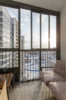 Лоджия из спальни с панорамным остеклением. На кухне вдоль всего гарнитура по двум стенам выложена плитка.
