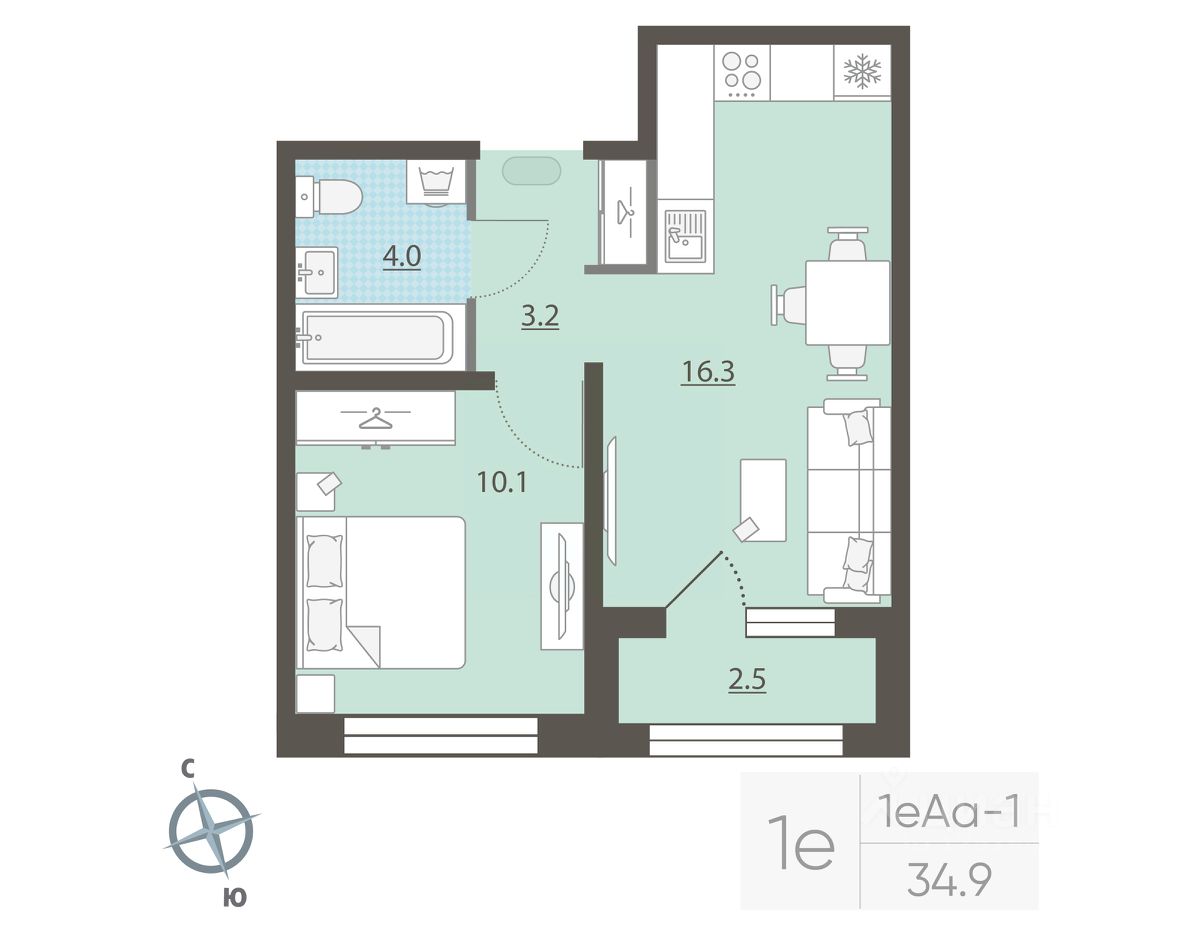 Жилая площадь 10.1 м2, кухня 16.3 м2, отделка под ключ. Раздельных санузлов - нет, балконов - нет, лоджий - 1.