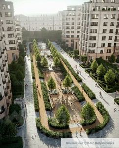 Закрытые дворы-парки без машин. Дворы похожи на мини-парки: Разновысотный ландшафт, максимальное озеленение, лежаки, лабиринты из растений и многое другое!