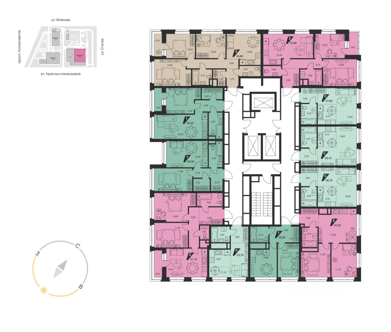 "Квартал К3" находится на перекрестке Космонавтов и Красных Командиров, в 10 минутах от станции метро "Уралмаш". Это три дома высотой от 9 до 26 этажей с благоустроенной территорией, озеленением, детскими и спортивными площадками.