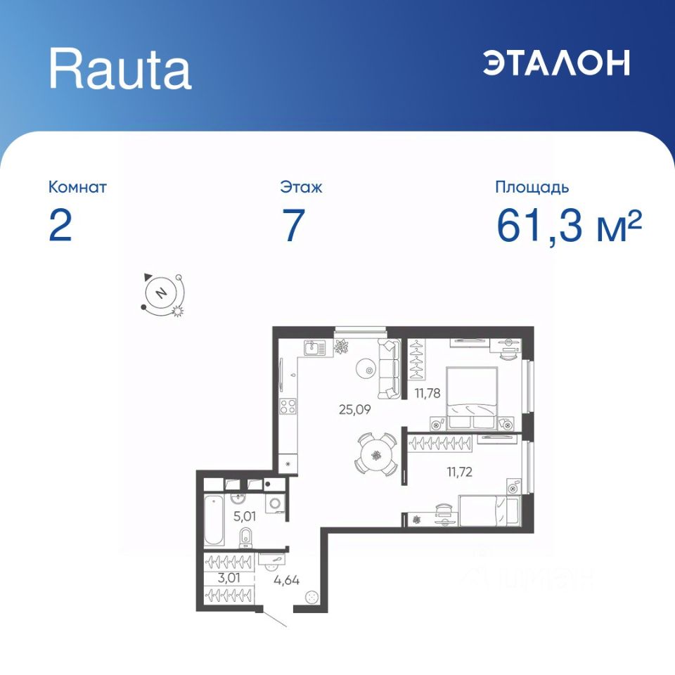Общая площадь квартиры — 61.25 кв. м, этаж 7 из 24.