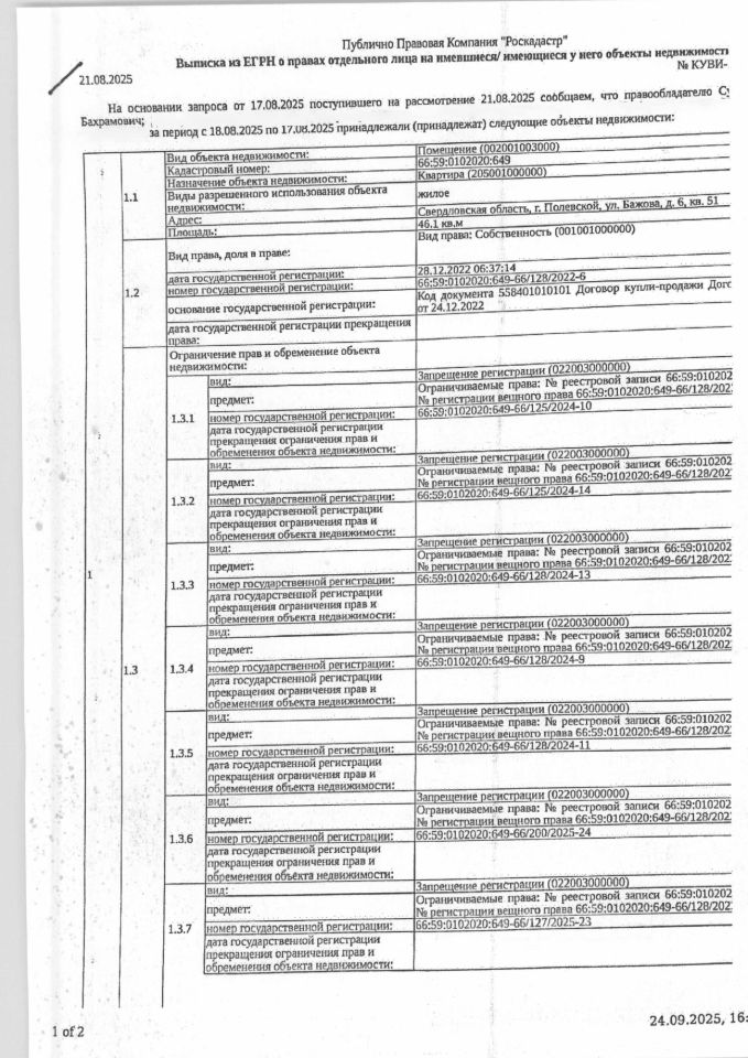 Должник: Сулейманов В.Б., собственник: Сулейманов В.Б. Лот: Жилое помещение (квартира), площадь 46,1 кв.м., кадастровый номер: 66:59:0102020:649, г. Полевской, ул. Бажова, д. 6, кв. 51, (зарегистрированные лица - отсутствуют), н/ц: 1586400 р., з-к: 1586 р., код: 0014, рег. 44-3378/25