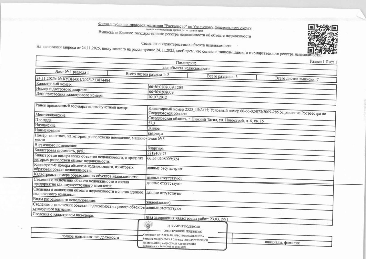 Должники: Пологов А.В., Пологова А.А., собственники: Пологов А.В., Пологова А.А. Лот: Жилое помещение (квартира), площадь 57,3 кв.м., кадастровый номер: 66:56:0208009:1205, г. Нижний Тагил, ул. Новострой, д. 6, кв. 15, (зарегистрированные лица отсутствуют), н/ц: 2437220 р., з-к: 2437 р. код: 0014, рег. 10-3306/25