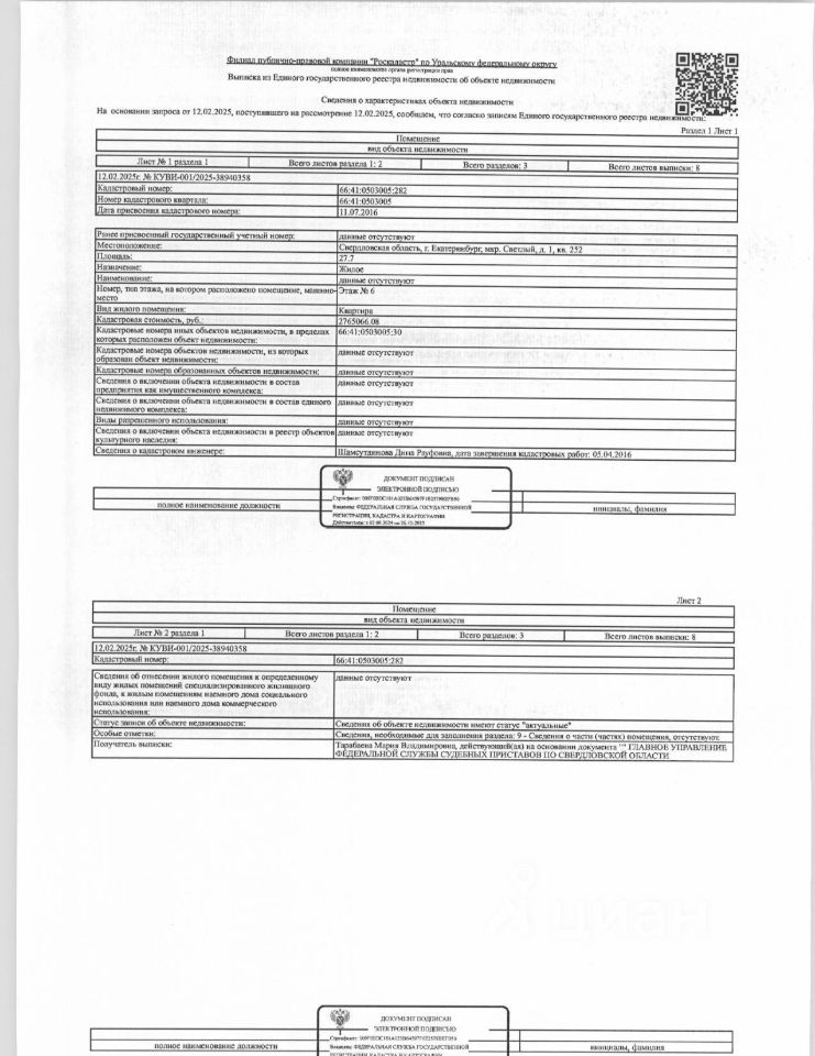 Должник: Иванова Г.С., собственник: Иванова Г.С. Лот: Жилое помещение (квартира), площадь 27,7 кв.м., кадастровый номер: 66:41:0503005:282, г. Екатеринбург, мкр. Светлый, д. 1, кв. 252, (зарегистрированные лица 5 взрослых), н/ц: 2376000 р., з-к: 2376 р., код: 0014, рег. 07-433/25