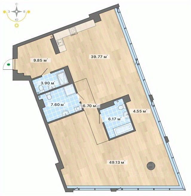 На выбор покупателей — апартаменты площадью от 48,5 до 131 м², в том числе свободной планировки. Из окон открываются панорамные виды на Екатеринбург-Сити и набережную Городского пруда.