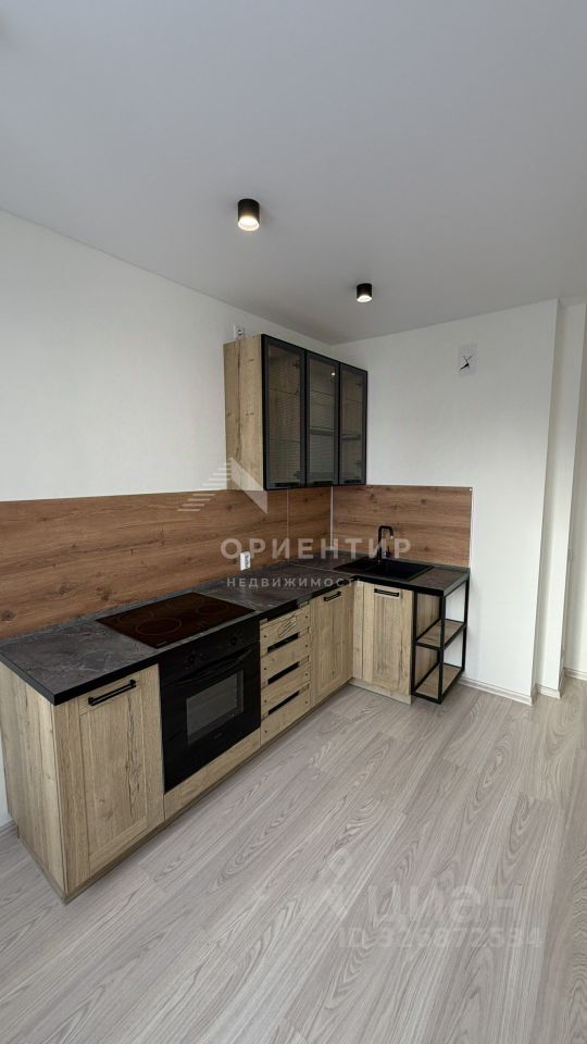 На кухне установлен дорогой кухонный гарнитур со встроенной техникой (духовой шкаф и варочная поверхность).