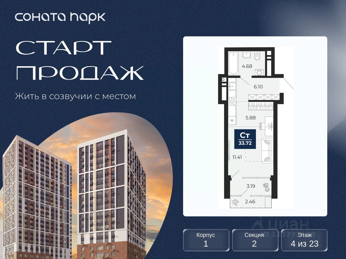 Просторная однокомнатная квартира-студия с предчистовой отделкой в ЖК "Соната Парк" на 4 этаже. Общая площадь: 33.72 кв.м. Высота потолков 2.72 м.