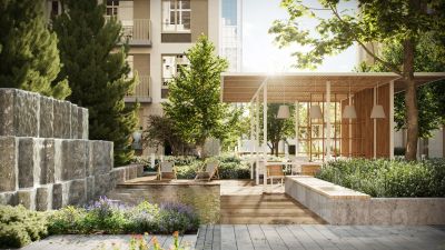 Благоустройство жилого комплекса это синтез искусства и природы. Поющие музыкальные инсталляции и поэтический променад. Оркестр растений: сирень, гортензии и яблони, чья цветущая палитра сменяется в течение года.