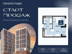 Однокомнатная квартира от застройщика с предчистовой отделкой в ЖК "Соната Парк" на 7 этаже. Общая площадь: 35.81 кв.м. Высота потолков 2.72 м.