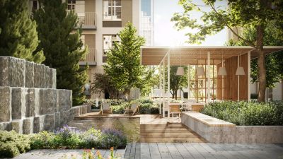 Благоустройство жилого комплекса это синтез искусства и природы. Поющие музыкальные инсталляции и поэтический променад. Оркестр растений: сирень, гортензии и яблони, чья цветущая палитра сменяется в течение года.