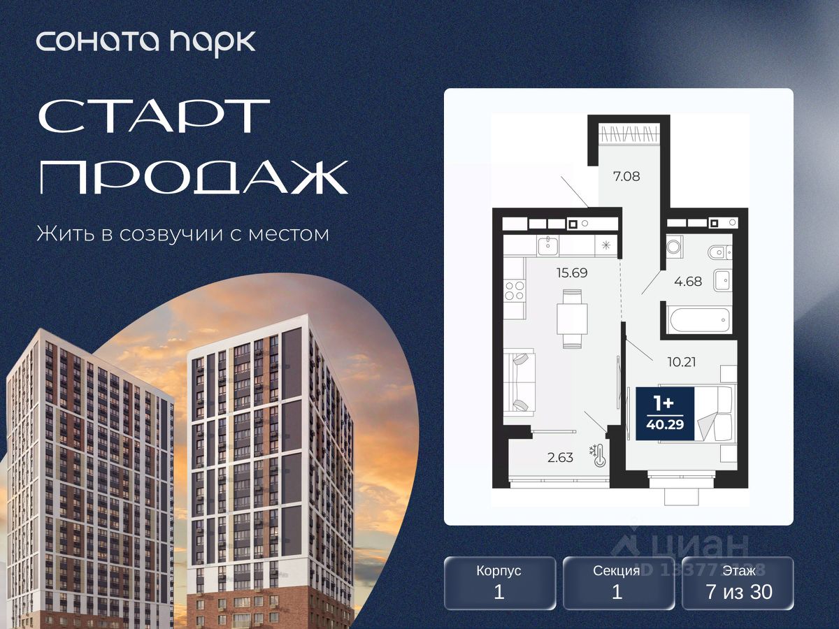 1-комн. квартира от застройщика с предчистовой отделкой в ЖК "Соната Парк" на 7 этаже. Общая площадь: 40.29 кв.м. Высота потолков 2.72 м.
