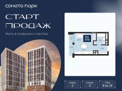 Однокомнатная квартира-студия с предчистовой отделкой в ЖК "Соната Парк" на 8 этаже. Общая площадь: 27.9 кв.м. Высота потолков 2.72 м.