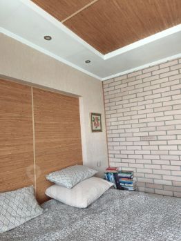 Интерьер выполнен с использованием натуральных материалов: светлый кирпич и бамбуковые обои формируют атмосферу спокойствия и уюта.