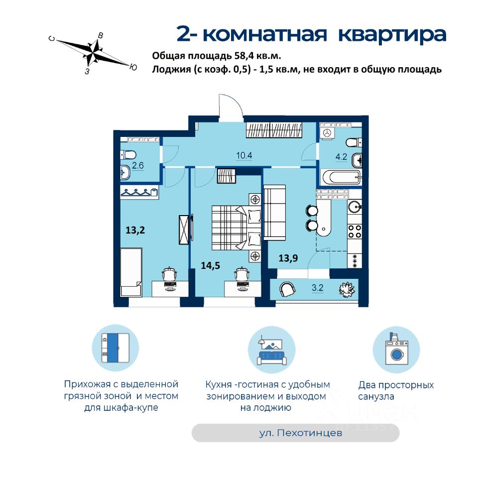 Продаётся 2-комнатная квартира в сданном доме (Пехотинцев, 2А/1), срок сдачи: I-кв. 2026, общей площадью 58.4 кв.м., на 24 этаже. Новый жилой комплекс "Estelle" от застройщика "СЗ Инвестстрой" расположен по адресу: г. Екатеринбург, улица Пехотинцев.