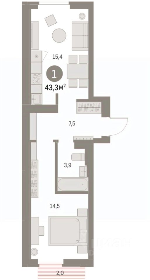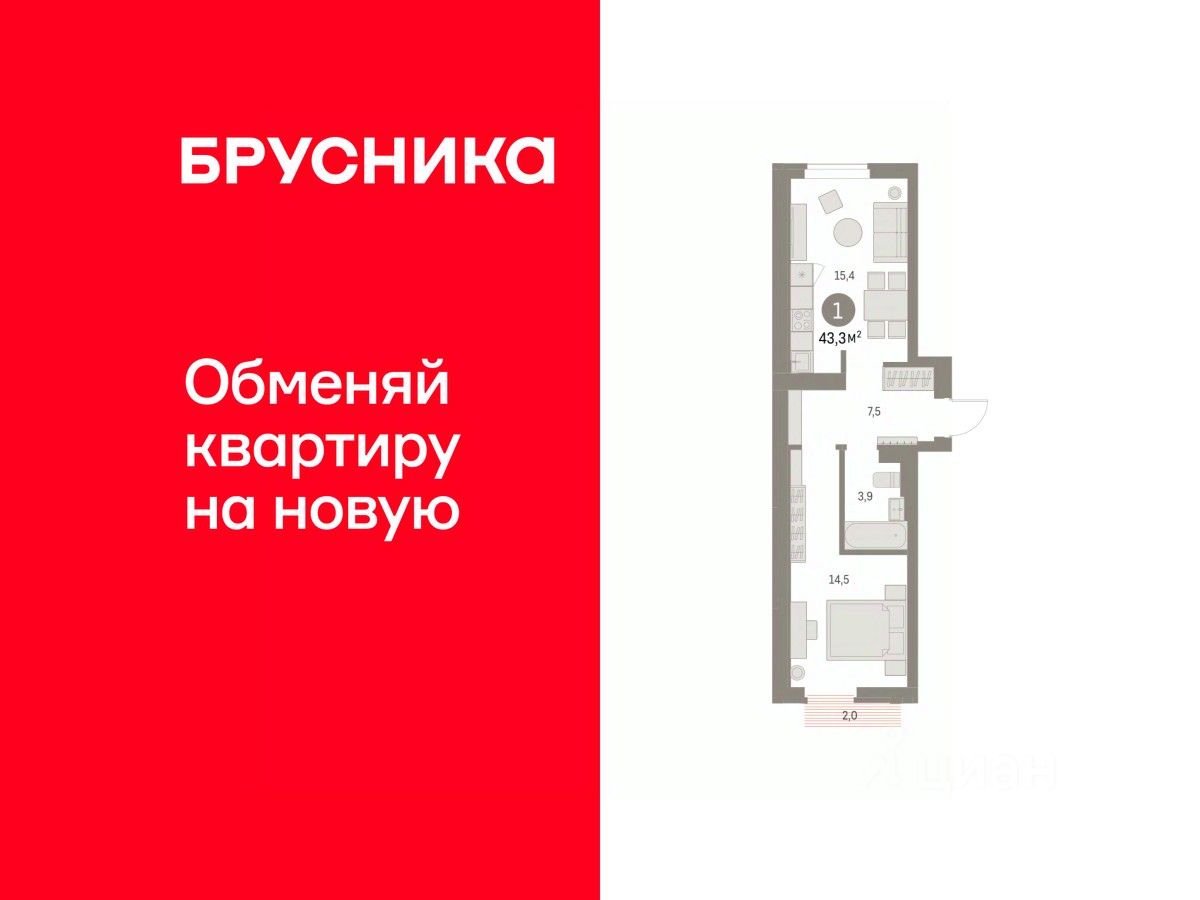 Квартира с кухней-гостиной и одной спальней в Бруснике в Академическом. Особенности планировки: балкон, вид во двор, предчистовая отделка.