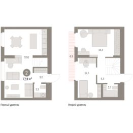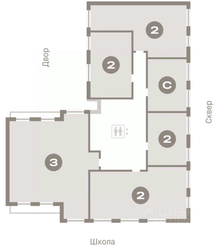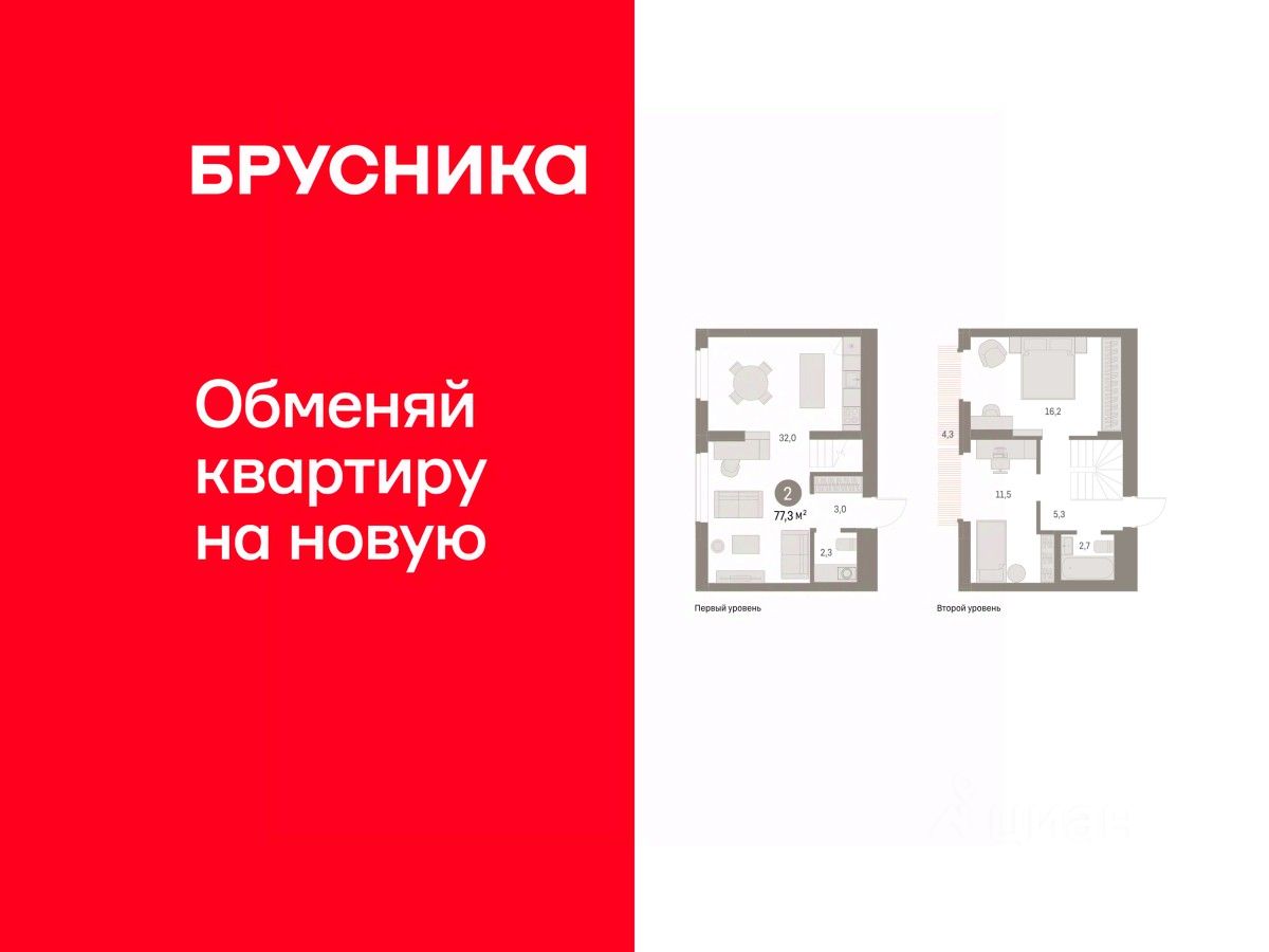 Квартира с кухней-гостиной и двумя спальнями в Бруснике в Академическом. Особенности планировки: балкон, вид во двор, второй санузел, предчистовая отделка, разнесённые спальни.